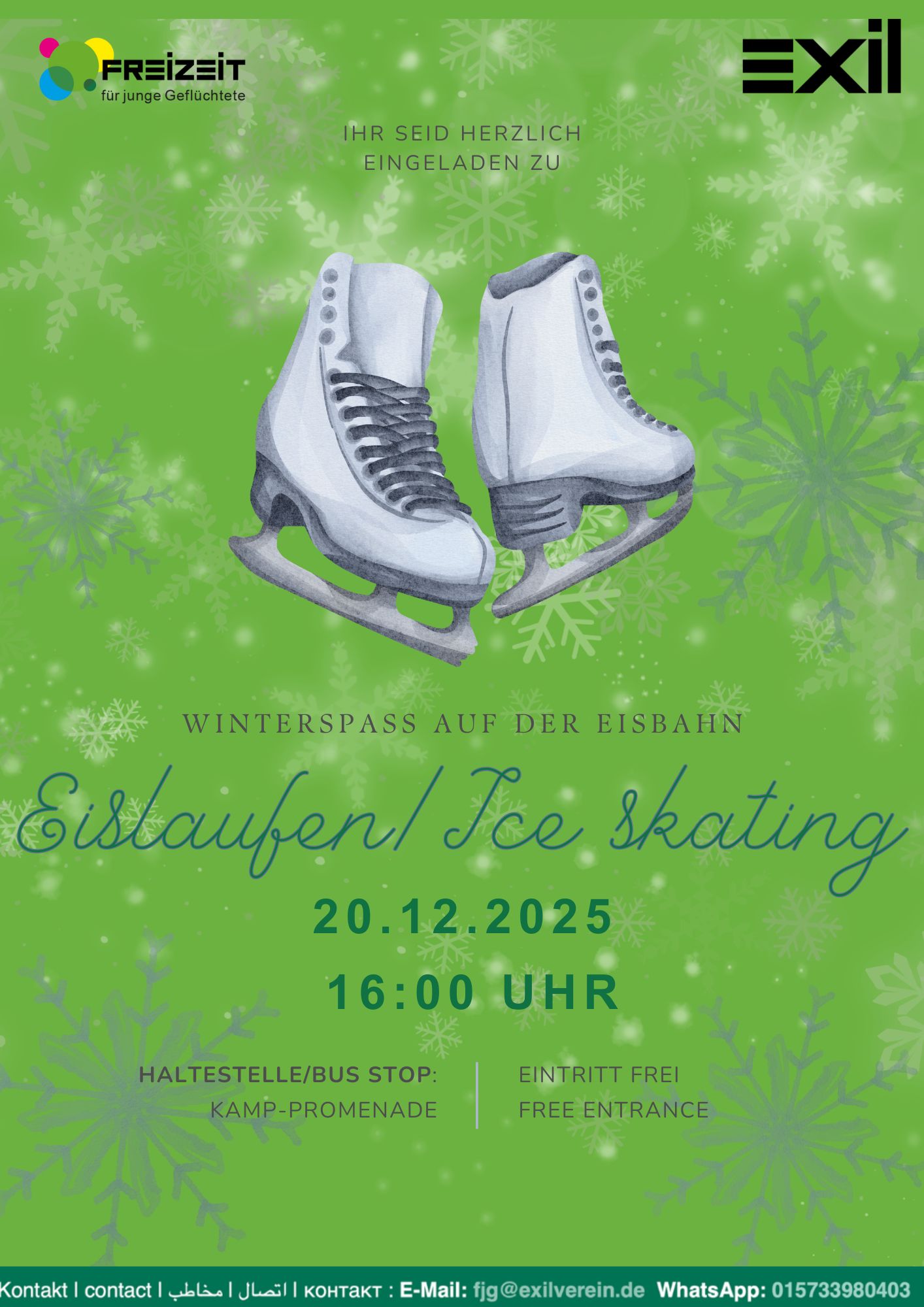 Von 16:00 bis ca. 19:00 Uhr heißt es: Schlittschuhe an und los geht’s! Wir wollen gemeinsam Runden auf dem Eis drehen und eine gute Zeit genießen.